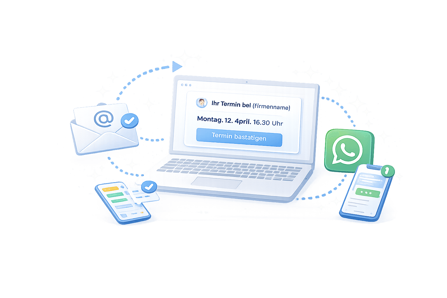 Bestätigungen, Erinnerungen oder Follow-ups können automatisch über E-Mail, SMS oder WhatsApp versendet werden – direkt nach der Buchung oder vor dem Termin.